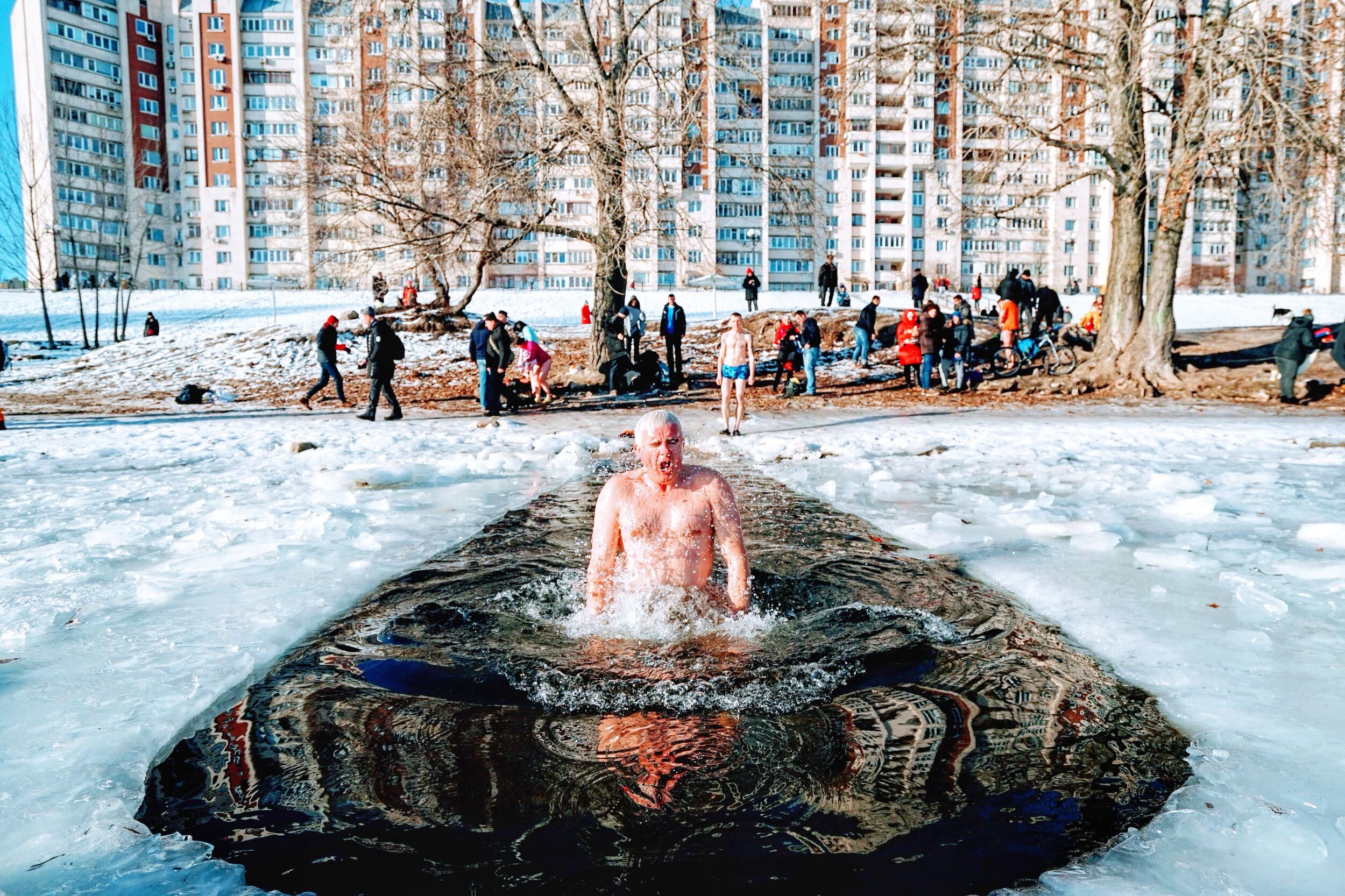 It's thought that plunging into the near-freezing water 3 times will rid one of illness and cleanse the soul.